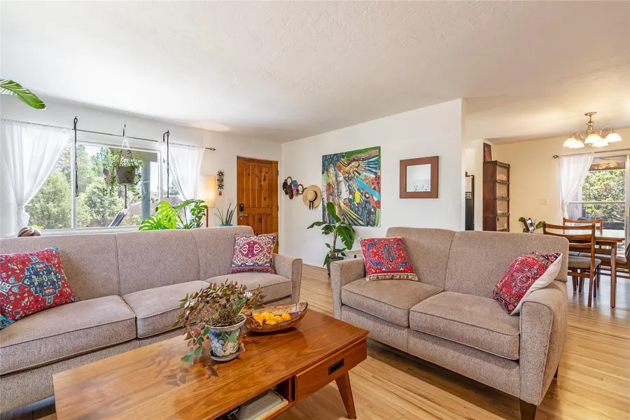 Beautiful Stamm home with garden oasis on a spacious half acre in a centrally located neighborhood away from the hustle & bustle of Santa Fe with easy access to all areas of town. Enjoy sunrises over the Sangres from the walled front garden, savor dining al fresco on the front pergola and covered back patio, and formal meals in the dedicated dining room. This 3 bed, 2 bath home has been lovingly updated with lush landscaping, refinished original hardwood floors, new tile floors and fresh paint while still maintaining its classic Stamm charm with a brick fireplace, original front and back doors, and original refreshed cabinets in the kitchen and guest bathroom. Expansive options for an addition to the main home or a separate casita while still maintaining a generous yard. This welcoming piece of paradise offers the best of all worlds, move-in ready with mountain views, peaceful ambiance, and room to grow, a mere 2.5 miles to the Plaza, 1.5 miles from Museum Hill, and even closer to restaurants, shopping hubs, parks, and the Santa Fe Rail Trail. Explore this dream of Santa Fe lifestyle today!