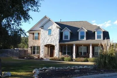 Limestone and brick exterior home on cul-de-sac with inground pool and attached/elevated hot tub.