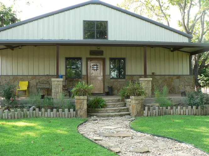 Over half an acre (4 lots on corner), landscaped and manicured with entry off two streets. Over 5,000sf of concrete slab, 1,400sf, 3/2 custom home, metal construction, rock accent siding. Very well built and well insulated. Low maintenance, efficiency home. Covered porches, attached 1960sf, 3 car garage/workshop with office/guestroom and half bath. Loft storage area, privacy fenced with separate yard area. Ideal spot for retirees with hobbies, within walking distance (1 block) of a great school and (2 blocks) to churches for small families, or just a cute, country type home in a wonderful small community.