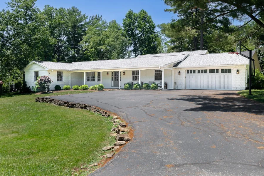 Spacious elegance in this Windermere ranch with renovations throughout. Situated on over a half acre this picturesque ranch has painted brick and siding exterior with a long, covered front porch. Flanked with wide plank engineered hardwood flooring, neutral colors and room to spare inside and out. Renovations include a rear addition creating open concept living and dining. Custom kitchen cabinetry, farm sink, floating shelves, tile backsplash, stainless appliances, 11 foot island and walk-in pantry are a few features to love in this stunning kitchen. Vaulted ceilings, masonry fireplace and a spacious mud room round out the north end of the home. Boasting generous bedrooms, abundant storage and a large primary en suite bath completed in 2022. Suite includes a walk-in closet with custom shelving, custom vanity with twin sinks, private commode and a jaw dropping tile shower with glass sides. Generous back yard is fenced with mature trees and an enormous patio great for relaxing, entertaining or recreation. Partial basement is versatile for a secondary living space, office, storm shelter or storage with natural light, a wide staircase and mechanicals in adjacent room. Excellent location in the heart of Bloomington with easy access to east side, IU Campus and downtown Bloomington.