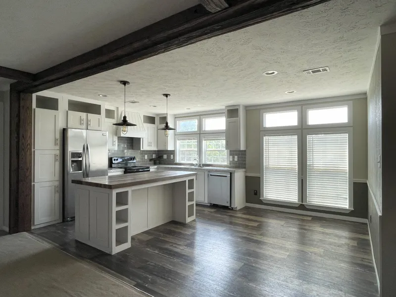 The open floor plan flaunts the attractive kitchen and dining area with plenty of natural light. The front entry foyer flows into the living area with faux shiplap and wood beam accents.