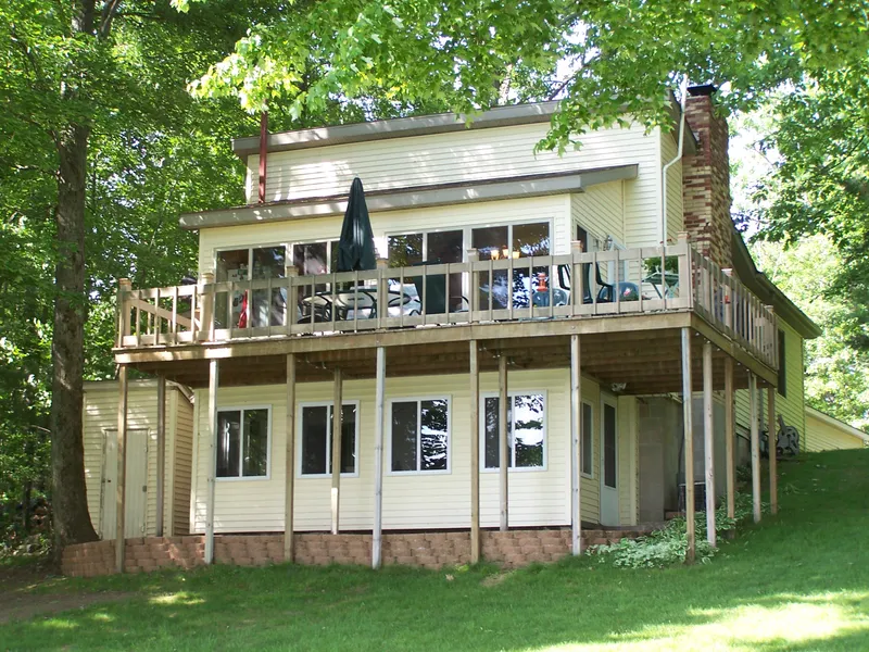 177 ft of waterfront on Gray Lake comes with this charming two bedroom, 2 bath home. Nicely landscaped yard, and an oversized two car garage. The home has an eat-in kitchen on the waterside and it opens to a large deck. Living room has a fireplace with wood burning insert. The two bedrooms have good closet space and built-in dressers. The master bedroom has a fireplace. There's unexpected luxury in the main floor bath. It has double sinks and large jacuzzi style tub. Sink into the tub and enjoy the fireplace, yes, fireplace in the bathroom. Relaxing doesn't get better than this. The lower level has a family room with small kitchen and a 3/4 bath. The lower level sitting room is all set up to enjoy the water view. There are so many things about this house that are special. The pontoon boat and boat trailer come with the house.
