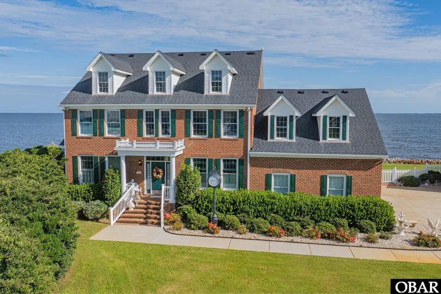 Make Your Waterfront Dreams Come True with This Coastal Jewel! Located in the highly desired boating community of Heritage Point, on the serene north end of Roanoke Island, this stately brick home is a rare find. If you're familiar with the abundant waterfront lifestyle in this prestigious neighborhood, you know opportunities like this are few and far between. Nestled on a sprawling 26,000 sq. ft. lot with an extraordinary 226 feet of water frontage, this beautifully designed 5-bedroom (septic for 4),3.5-bath, brick estate offers approximately 3,700 sq. ft. of living space. It showcases breathtaking views of the Roanoke Sound from nearly every room. Tucked away in a tranquil setting, the private backyard overlooks the Fort Raleigh National Historic Site and the expansive Roanoke Sound. Designed for quintessential indoor-outdoor living, the home welcomes you with a two-story foyer featuring custom carpentry and hardwood floors throughout. An adjacent study flex space that could be a formal dining room or office, while the expansive great room is bathed in natural light and anchored by a brick fireplace, and a wall of water views. The space flows seamlessly into the open chefs kitchen, which is a showstopper, with recessed lighting, subway tile backsplash, glistening guartz countertops, custom soft-close cabinetry, whirlpool stainless steel appliances including a gas range, and a dining area. The main level features a powder bath, one of two spacious primary suites, with stunning water views, a tray ceiling, and a luxurious ensuite bath, with custom tile shower, soaking tub, private water closet, and one of two sets of a washer and dryer. Upstairs, you'll find three additional bedrooms, including a second grand primary suite with its own gracious covered porch ideal for guests or multi-generational living. The private ensuite showcases a tile shower, water closet, and a soaking tub. A shared full bath with a shower and a flexible bonus room with lots of storage, water views, a space for play, workout, relaxation, or media. Also, the 2nd stairwell leads to the ? bath and the garage. Outdoor living is equally impressive: At the waters edge, a private pier built for entertaining awaits, featuring three built-in bench seats, a bar, and water and electric connections, making it the perfect spot for sunset gatherings, fishing, or docking your boat. This space is ideal for gatherings where you can easily fit 15 people comfortably. Boaters will also appreciate the boat slip the community marina. The meticulously maintained exterior features low-maintenance brick siding, a fenced backyard, luscious landscaping, and an irrigation system. The 3-car garage includes a lot of storage. Theres another separate 2-bay garage with French doors leading to the backyard. Open the doors to wind off the water while woodworking or enjoying the man cave. Heritage Point offers tennis courts, a fitness center, and a soundfront beach with a gazebo and pier. Outside the neighbor