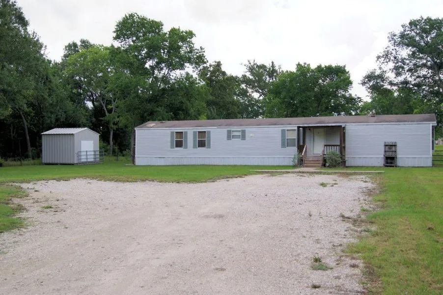 Contract Pending! Madisonville - Fantastic, affordably priced home available in town! 3/2 manufactured home, 1216 SF (per CAD) on 0.61 Acres surrounded by ranch land. Walk outside on your 2-level deck & take a look at the beautiful ranch land with horses grazing all while being minutes from schools & shopping. Home is move-in ready w/ split floor plan, large living room & eat-in kitchen. Back yard is fenced with small animal pen, storage building & carport. Asking $65,000