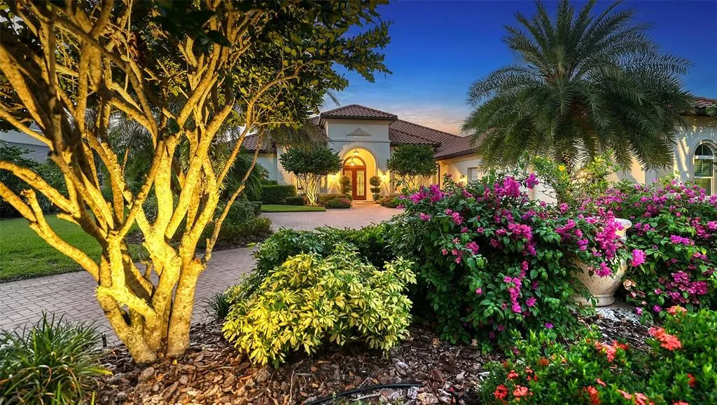 Enjoy a peaceful drive through tall pines, tropical palms and moss-covered oaks on your way to this stunning London Bay estate residence set privately on the 16th fairway of the prestigious Founders Club. While the exterior offers picturesque golf course and lake views, the interior is designed with an exceptional level of finishes, architectural details, volume ceiling heights, and chiseled-edge travertine flooring. The kitchen is the heart of this home featuring a large island with storage, stainless appliances, double oven gas range with decorative hood, solid wood cabinetry, and quartzite counters. Featuring formal and casual dining rooms, home is ideal for entertaining and offers a butler's prep room with sink, additional dishwasher and counter space. Indoor and outdoor living space blend seamlessly with disappearing sliders from great room to lanai featuring an outdoor kitchen and sparkling pool and spa. The split bedroom plan affords owners their privacy and all guest rooms a private bath. Those who work from home will appreciate the office with French door entry, wood flooring and dramatic tray ceiling. Additional home features include fenced-in dog run, impact glass, tile roof, water filtration and softener, custom closets in all bedrooms, plantation shutters throughout, slider access to lanai from bedroom four, gas fireplace in living room, wood-beamed ceiling in kitchen and great room, extra wide base and crown moldings throughout, drop zone with desk and storage cabinetry from garage, utility sink in laundry room, paver lanai and more. Founders club is a private gated community with optional club memberships including golf, tennis, fitness, dining and social. Conveniently located close to shopping and dining of downtown Sarasota, Waterside Place, Lakewood Ranch, and University Town Center as well as medical facilities, cultural venues and beaches.