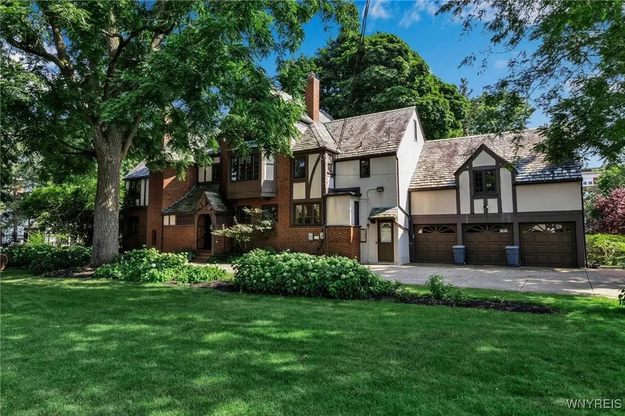 Welcome to this exquisite stately Tudor-style Historic Home, originally built for the Oishei family that offers both charm and gorgeous architecture throughout. This home offers an abundance of square footage and endless possibilities. The formal and informal living space gives you the best of both worlds, and includes 9 bedrooms, 6 full/2 partial baths. Gleaming hardwood floors on much of the main story, and an astonishing multi-level spiral staircase invite you to see the possibilities in your future new home. Other unique features include a lovely stained glass window, a desirable morning room with a hand painted mural and gorgeous indoor trellis doors. The kitchen has an abundance of space and natural light, perfect for entertaining. The woodwork throughout is notable and offers the appeal that you've been looking for. The basement is partially finished and offers additional storage, laundry, a walk in pantry, and a historic built-in Cary safe. Offering plenty of space for you to transform into your own, this one is truly a "must-see". With a private driveway, the location cannot be beat- near the historic Elmwood Village, and just a short drive to downtown Buffalo. Taxes TBD