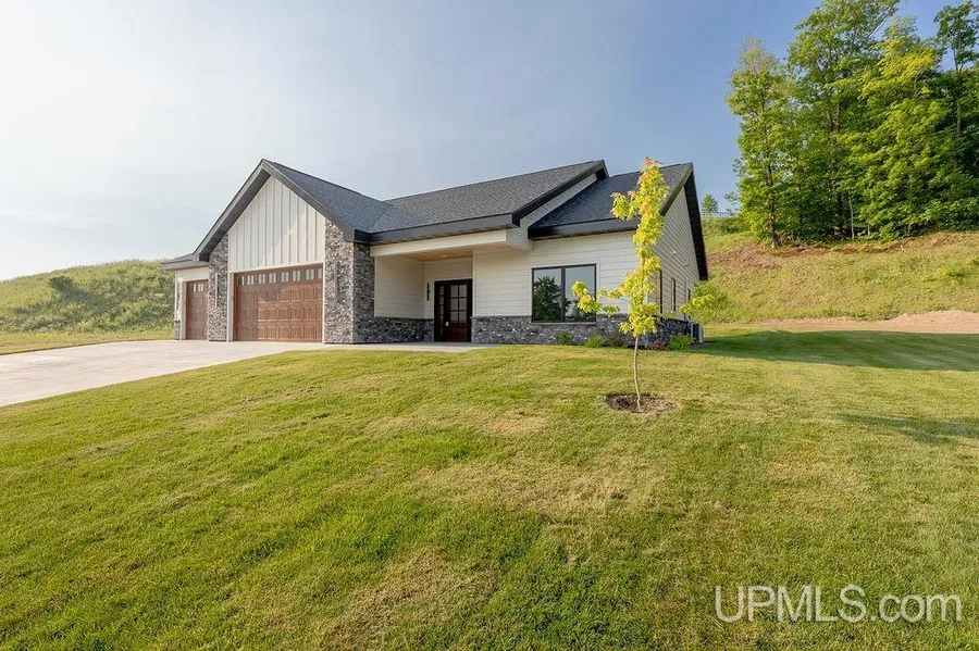 This brand-new home is currently being built in one of the City of Houghton's newest developing neighborhoods on a low traffic street. Construction of this 3 bedroom, 2 bathroom residence, started in 2024 and is a great opportunity for your next home! Upon entry, you'll be greeted by a nice foyer with a coat closet leading into a vaulted open great room for your living space. This area encompasses the living room, dining room, and kitchen, all featuring luxury vinyl plank flooring. The kitchen will showcase wood-stained cabinets, quartz countertops, modern pendant lights, and includes brand-new stainless-steel GE appliances. To the right, down the hall, are two spacious carpeted bedrooms and a full bath with tile flooring. Just beyond the vaulted living room, you'll find the primary bedroom suite, complete with a full bath and a closet. This home will have modern but classic finishes throughout to ensure a timeless and elegant aesthetic. Every detail, from quality materials to sophisticated design elements, has been thoughtfully chosen to create a seamless blend of contemporary style and charm. Off of the living area you will find the laundry area, mudroom with an extra washing sink, and sauna with changing room and shower. This area provides direct access to the three-car garage with access to the mechanical room. Outside, the home will feature a concrete driveway and an in-ground lawn sprinkler system. Situated on approximately half an acre, this home is a great opportunity to live in the City of Houghton, close to the city conveniences, Michigan Technological University, and on a lower traffic street. NOTICE: All information believed accurate but not warranted. Buyer recommended to inspect & verify all aspects of the property & bears all risks for any inaccuracies including but not limited to estimated acreage, lot size, square footage, utilities (availability & costs associated). Real estate taxes are subject to change (possibly significant), property will be reassessed by the municipality after sale is completed & buyer should NOT assume that buyer's tax bills will be similar to the seller's current tax bills. Taxes are not zero. Seller may have audio/video recording devices present on the property and buyers and agents consent to being recorded by entering property. OFFERS: 72 hours response time requested on offers. Seller, at seller's sole discretion, with or without notice, reserves the right to set and/or modify offer submission & response deadlines.