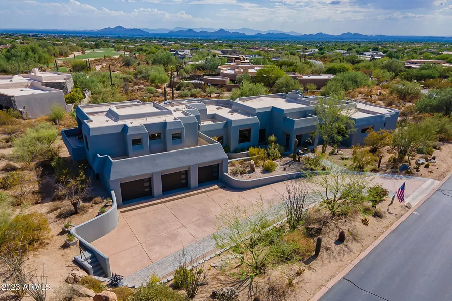 IMMEDIATE GOLF MEMBERSHIP in the country club community of Desert Highlands and expansive MOUNTAIN and CITY LIGHT VIEWS. FIVE car garage. Recently completed renovation reveals warm sleek design. Fully redesigned kitchen and open concept dining room. Custom Mocaccino Bellmont cabinetry, Quartzite counters, waterfall island, cascading natural light, coffee bar, multiple pantries and breakfast bar overlooking the great room. Great room showcases floor to ceiling matrix granite surrounding the linear gas fireplace, a wet bar, multiple seating areas, gorgeous mesquite hardwood floors, 13 ft beamed ceiling and exceptional flow for entertaining. Main level primary suite with seating area features a newly expanded ensuite with floor to ceiling granite and tile, heated spa tub, walk-through shower, separate vanities with oodles of storage and a colossal custom walk-in closet with built-ins and washer/dryer. Secondary bedroom with ensuite, two posh powder rooms, plus a full laundry/storage room complete the main level. Upstairs (above garage only) you'll find a private guest retreat with separate seating area, bonus room/office, ensuite with dual vanities and separate tub and shower, walk-in closet and stunning views from the private balcony with stairway access to the patio below. Five car garage with 4 car tandem parking in one bay and an additional bay for 5th car parking or plenty of room for toys, plus built-in storage, separate storage closets, epoxy floors. The serene south facing backyard is private, spacious and offers a view of the champions tee of the 5th hole. It features a covered patio, built-in BBQ, heated spa and rooftop deck for stunning sunrises, sunsets, desert and mountain views plus sparkling city lights. **See Documents tab for extensive features/upgrades list** Desert Highlands Club is a private guard gated community and is ranked the #12 top Golf Club in America 2023-2024 by Platinum Clubs of America! World class amenities include; 18-hole Jack Nicklaus Signature course, Gary Panks' designed 18 hole putting course, 13 tennis courts (clay, grass & hard surface), pickleball courts, bocce ball courts, 7,700 sf state-of-the-art fitness center, fishing pond, dog park and meandering walking/biking path. Enjoy fine dining at The Ventana or more casual fare at Jack's Gastropub. Be on the golf course as soon as you close. Start living the world-class life that you deserve in this magnificent contemporary estate.
