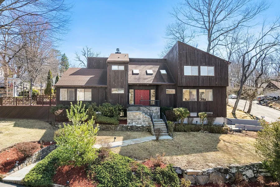 Fabulous 5 BR/3.5 Bath Contemporary style home nestled amid the privacy of its mature trees and lush plantings, this expansive residence offers an inviting atmosphere with its large 2 story entry hall and an open floor plan that seamlessly blends indoor and outdoor living. This home features a wide-open floor plan that allows for effortless flow between the living, dining, kitchen and large sunroom areas. Soaring ceilings and expansive windows ensure that each room is bathed in sunlight, creating a bright and airy ambiance. The modern chef's kitchen is equipped with Viking appliances, sleek countertops, and ample storage, designed for both everyday cooking and entertaining, with a large island that doubles as a casual dining spot, a desk area and open to the Living room with fireplace/built-ins with easy access to the huge sunroom that leads out to the patio and extensive multiple decks with commercial grade lightings that make night time entertainment a pleasure. The main level also offers a powder room, large versatile room with high ceilings & French doors out to the deck and a main floor bedroom. Up to the second level, you will find the primary bedroom, a serene retreat with large windows offering picturesque views of the surrounding greenery with an en-suite bathroom that boasts a spa-like feel with a soaking tub, walk-in shower, and dual vanities. Three additional bedrooms, each designed with comfort and privacy and a full hall bath en-suite with soaking tub and shower complete this floor. The lower level offers many flexible spaces that can be adapted to suit your needs with a large rec room, bedroom, full bath, large pantry, storage area and a large multi-purpose room with a door out to the garage-perfect for a guest suite, au-pair or customize the versatile space to your liking. Outside you will discover multiple entertaining areas with patios and decks perfect for al fresco dining or simply enjoying the tranquil surroundings. The mature landscaping ensures privacy, while the carefully designed garden areas add to the overall sense of serenity. Centrally located 30 mins to NYC, Town of Greenburgh Recreation, Hartsdale train parking and Ardsley Schools make this home a must see!