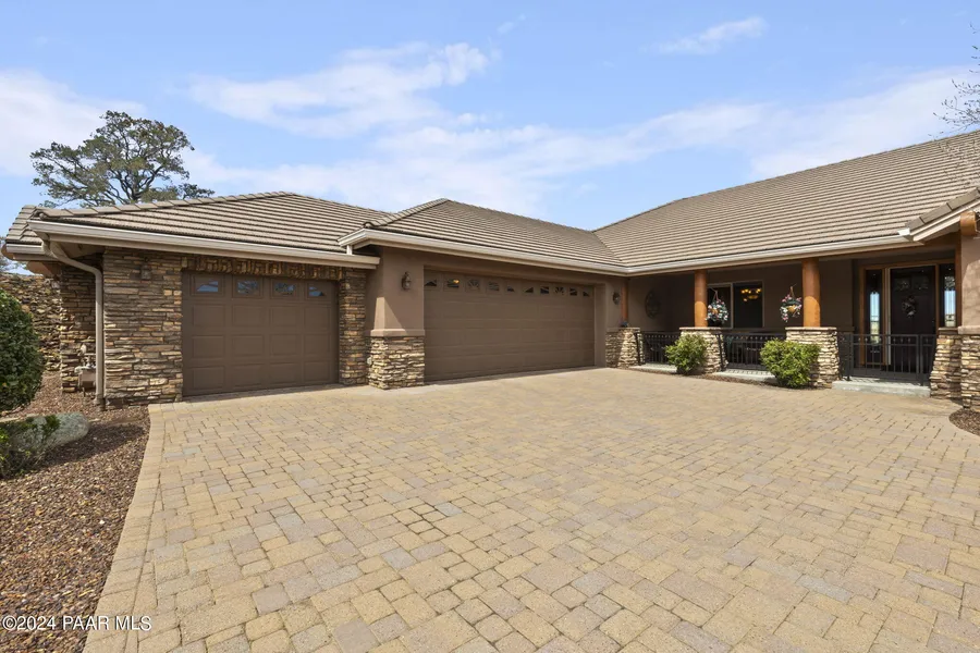 This Magnificent 5 Bedroom, office on main, 4.5 Bath Home is located on a quiet cul-de-sac within the coveted Estates gated community in Prescott Lakes. The home borders and overlooks the 5th hole of the Hale Irwin-designed Prescott Lakes Golf Course and has tremendous forever views of Granite Mountain, the San Francisco Peaks and the Prescott Dells. The main floor (approximately 3,100 sq ft) offers one-floor living with three bedrooms, including the master bedroom suite, with vaulted and corniced ceilings and 8 ft doors with a gas fireplace on each level. All rooms are spacious and all bedrooms have walk-in closets. The home is elevator-ready with dual-stacked large closets designed as an elevator shaft with electrical and phone jacks in place. (See More)