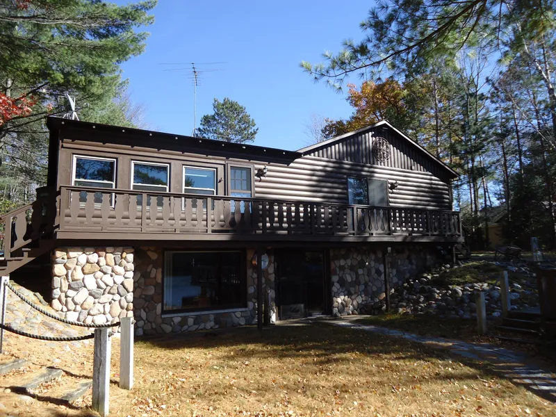 Within one of the most desired and largest bodies of water in the N'Woods, this private retreat is supremely situated on the east shore of Paradise Bay! The best of both worlds are now available... thousands of acres of expansive water at your fingertips, with a protected home base refuge. Conveniently located only 10 minutes from Minocqua and surrounded by endless recreational opportunities. Your own boat house with the priceless "party/sun deck" and the favored western exposure. Gradual approach to the sand swimming shoreline that is visible from the lower level rec room, main floor living room and the wrap around lakeside deck. Log sided ranch style family home features 2,500+/- finished sq ftg. Comfortable floor plan boasts a master suite with 2 add'l bedrooms and 3 total bathroom areas. Well-manicured grounds, welcoming blacktop driveway and a 744 sq ft garage! Add'l attributes incl...