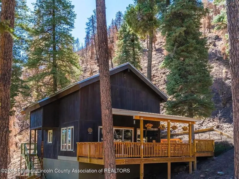 Super Upper Canyon Cabin with wonderful rustic flair. Property features 3 bedrooms, 2.5 Baths, vaulted wood ceilings with beautiful wood beams, built in bunk beds, stainless steel appliances, thoughtful furnishings and decor throughout, stellar fireplace, split unit heating and cooling and a large deck with soft views of Sierra Blanca and the Rio Ruidoso. Don't miss this opportunity for a turn key nightly rental!