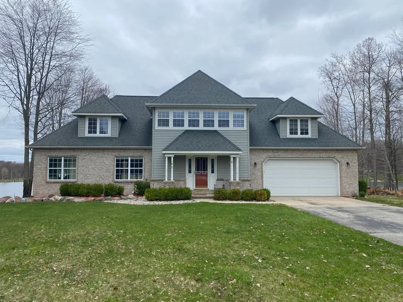 A majestic contemporary home sitting on .66 acres with 100 feet of private lake frontage on the scenic Fawn Lake. Enjoy panoramic views of the lake from a large wall of windows while relaxing in the living room or while catching up with nature on the spacious deck. Tile, oak and bamboo flooring accent the two story home while stainless steel appliances give a sophisticated look to the open concept kitchen. The main level has a front entry, powder room, a harmonious living room, large dining room, master suite with a jetted tub, and a laundry room . The upper floor features two exquisite bedrooms, office area, full bath, and an inviting family room with a fireplace. Brick and vinyl make the exterior captivating and easy to maintain. This home is available for year round living or a vacation home.