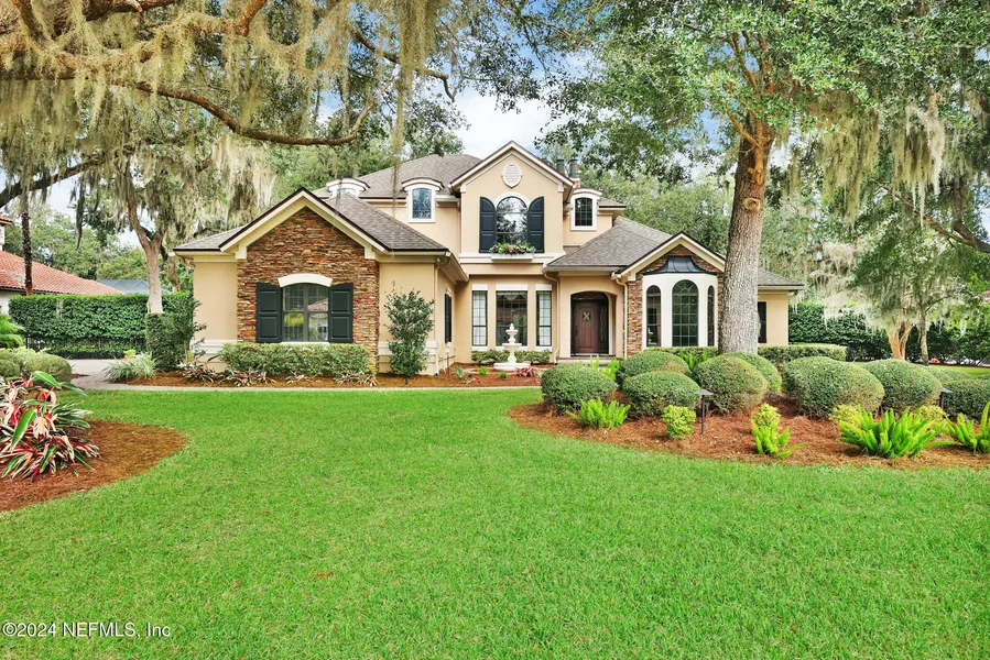 Exceptional John Kenny built home nestled under sweeping Oaks in the heart of Palencia! Gorgeous curb appeal w/ timeless architectural elements: stacked stone, window flower box, copper accents, timberland wood shutters, paver walkway & tiered fountain, This 4 bedroom 3.5 bath home is meticulously maintained by the original owner. Step into 2-story foyer through custom mahogany, iron & rainglass front entry. Exquisitely rounded staircase & custom wide Oak flooring. high ceilings, custom moldings & arched niches adorn the space. Floor to ceiling windows bring the outdoors in. Grecian key molded mantle over gas fireplace with built in grass cloth backed shelving w cabinets. Mirrored Butler's pantry off dining room provides easy access to linens & bar ware. Kitchen features GE monogram appliances & subzero refrigerator, GE Wine chiller. Spacious downstairs primary suite w/ built-ins custom closet, walk-in shower & Jacuzzi tub. Outdoor lanai features built in Grille & artistic fire bowl.