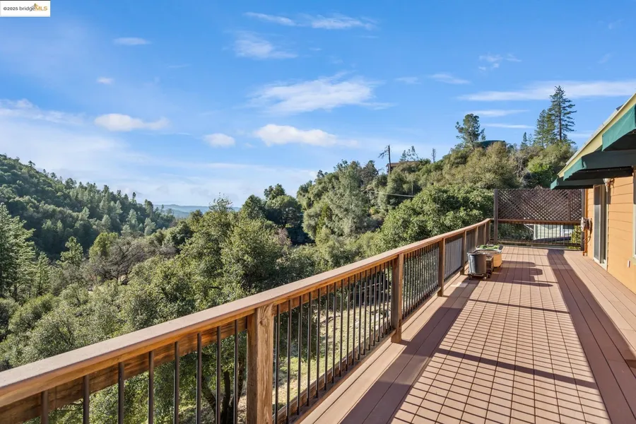 Price Improved!!!This home is situated on a quiet cul-de-sac at the entrance of Ponderosa Hills. Private entry offers a fully fenced courtyard with a sauna and outside shower. The home offers 4166 sq. ft with 5 full bedrooms and 4 full baths with a total of 19 rooms. Primary bedroom on entry level with an view and 2 additional bedrooms with 2 full baths. The view from the rear deck faces south and provides the owned solar panels with extensive sun exposure and an amazing view. The great room is open to the kitchen with a breakfast bar and it shares the beautiful view. Solid hickory hardwood flooring in main living space. Upstairs is a warm & cozy private bedroom. Downstairs has 2 additional spacious family rooms , 3 bedrooms, 2 full baths with a separate laundry room. There is a pedestrian easement to the year round Turnback creek. Newer composite decking with extensive permitted reinforcement. The custom drapes in the great room give thermal sound and black out capability. Only a few steps away from the community pool with a club house and picnic area for the family to enjoy. It could also be used as a rooming house creating income. No current electricity bill! Black Oak Casino is minutes away.