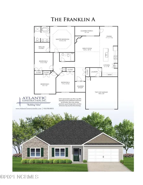 Atlantic Construction is now building their affordable homes in Sewell Fields of Verona! The Franklin plan is all about one story living with 1821 heated square feet & the space to meet your needs! It's got the open living area everyone wants with a corner gas fireplace, a spacious kitchen with a work island & a pantry, work station for a home office or virtual school, plus there's a covered porch off the dining area. The owner's suite features a trey ceiling with a walk in closet, double vanity sinks, and a separate soaker tub and walk in shower in the bathroom. The Bonus room might be the perfect spot for a home office, game room, or play room for all those toys! There's a minimal HOA and no city taxes in this community, and you are just a short drive from MCAS New River, Camp Lejeune, Stone Bay, or the beaches of Topsail Island. Act quickly and you can pick the colors you want to suit...