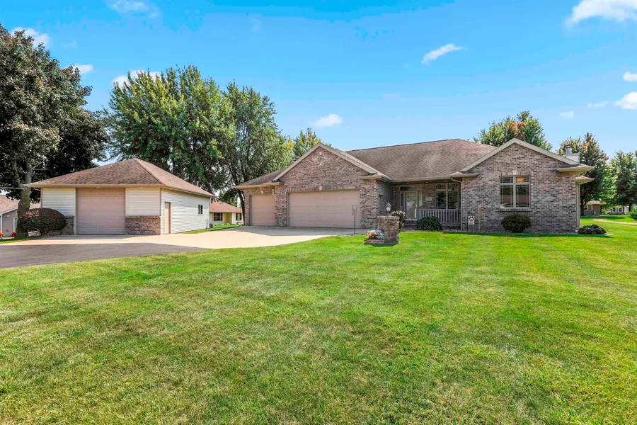 Custom Built! 3 bedroom, 2.5 bath ranch on .67+/- Acres. Endless amenities. An open concept living area boasts kitchen with hickory cabinetry, tile floor, and peninsula snack counter. The dining area features hardwood floors. Sunken living room with cozy wood burning fireplace. Primary suite offers a tile shower, dual sinks and walk in closet. Two additional bedrooms, second full bath, and laundry room with half bath complete the main level. Attached 3.5 car garage with tandem stall is heated with water, drain, and basement access. Detached 2.5 car garage is also heated and includes water and drain. Kitchen and bathroom with in-floor radiant heat, lower level stubbed for a full bath, and more!! Showings start 9/13/2022.
