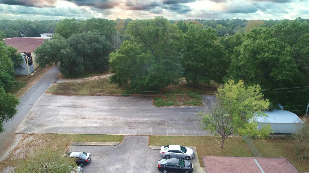 Condition: paved parking lot, cleared grass area, two sheds, some trees