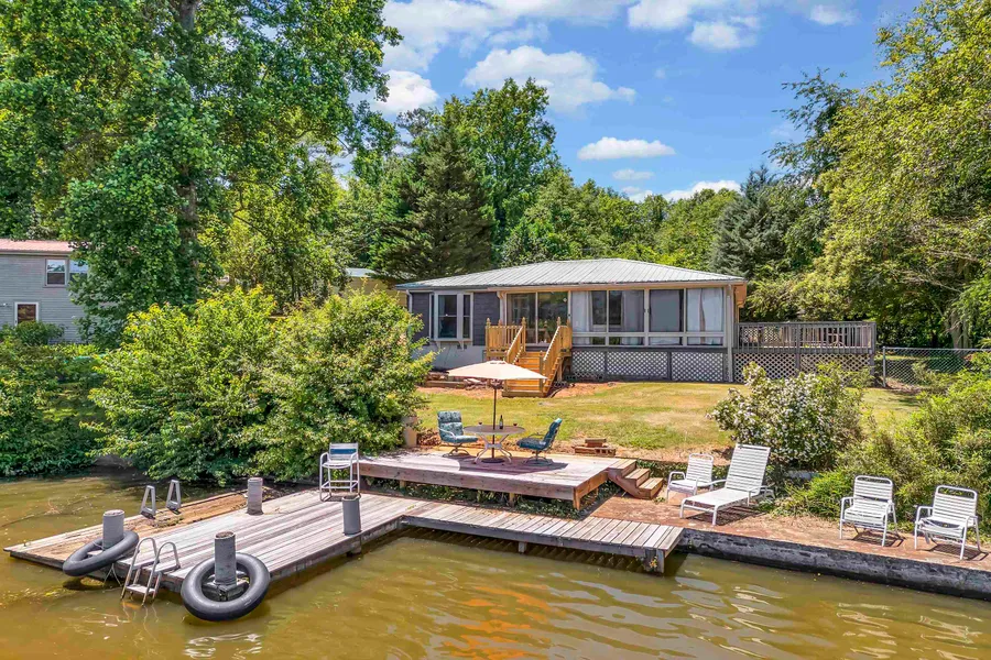 Nestled amidst the tranquil shores of Broadway Lake, this charming, renovated cottage offers the ultimate lake house dream. With 120 feet of lake shore and a large permanent dock, you'll have endless opportunities to fish, swim, and soak up the serenity of waterfront living. Escape the confines of HOAs and restrictions. This property allows you to customize your dock or pursue your homesteading aspirations by raising a few chickens. Step inside to a cozy retreat featuring three bedrooms, one with a breathtaking lake view. Two full bathrooms provide ample convenience, while the newly remodeled eat-in kitchen boasts a large island, farmhouse sink, solid surface countertops and new refrigerator and range will convene. Gather in the dining area, warmed by a gas fireplace that can be converted to burn wood. This space seamlessly flows into a flex room with sliding doors, offering a tranquil spot for a third bedroom, work or relaxation. The inviting living room with hardwood floor leads to an all-season sunroom, where you can bask in the panoramic views of the lake. Venture outside to the flat, fenced-in front yard, perfect for outdoor games and activities. A two-car enclosed carport provides ample parking, while a large workshop offers plenty of storage space. Two new sets of wood stairs provide convenient access to the entry door and lake. Enjoy the fresh air on the large viewing deck on the side of the home, which leads to a second fenced-in area ideal for children or pets. On the backside of the house, a workshop/storage area is perfect for storing lake and yard gear. This home has been meticulously updated with an upgraded metal roof, new windows, new plumbing, new septic system, and a new heat pump HVAC system. These upgrades ensure comfort and efficiency, allowing you to focus on enjoying your lakefront paradise. Don't miss out on this exceptional opportunity to live the lake house dream. Make your appointment today to experience the tranquility and beauty of Broadway Lake firsthand.