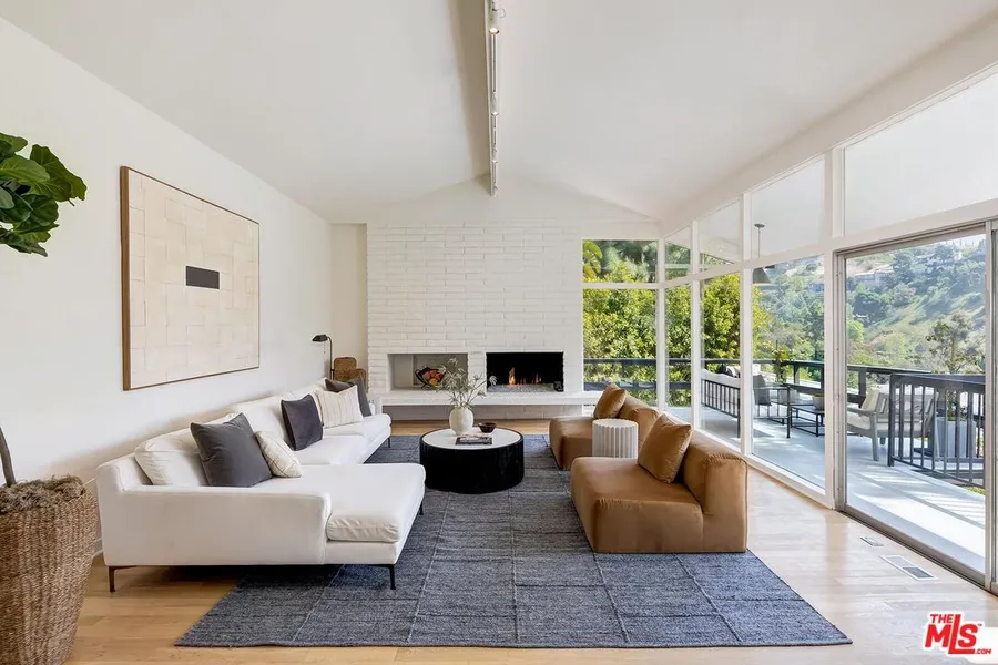 Set down a long gated driveway is this Mid-Century jewel. Chic living room with hardwood floors, fireplace and walls of glass overlooking stunning canyon views. Large dining room, remodeled eat-in kitchen, family room. Primary suite with private romantic terrace overlooking verdant hills. There are two additional bedrooms plus powder room. Beautiful yard with pool, cabana and terraced gardens. 2-car garage with additional parking; plans to convert garage to ADU. Magical living in the hills!