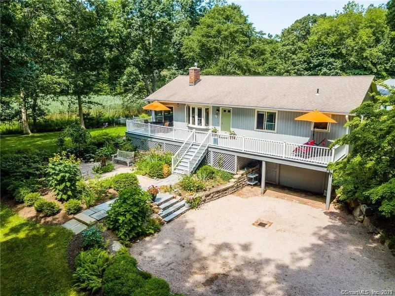 Set on a private cul-de-sac and down a gravel drive, nestled in lush greenery, sits this charming home with water views in the peaceful shoreline neighborhood of Hawk's Nest Beach. Revel in the serene calm as you take in classic views of the large open marsh and Long Island Sound from the generous deck of this expanded ranch complete with deeded rights to Hawk's Nest Beach. Recently renovated, the open floor plan creates an effortless flow throughout the living room, dining room and lovely kitchen with stainless appliances. Natural light fills this home through the ample bay of windows that line the delightful enclosed porch. Enjoy the convenience of 3 full baths. Take your choice of the three bedrooms; one on the main level that connects to the enclosed porch, another off the kitchen or the third downstairs. The lower level has been completely redone with built-in shelves, propane stove and easy access to the one car garage under home and mudroom. Thoughtful landscaping, stone work and elegant English gardens circle the outdoor brick patio creating an idyllic scene worthy of a water color painting.