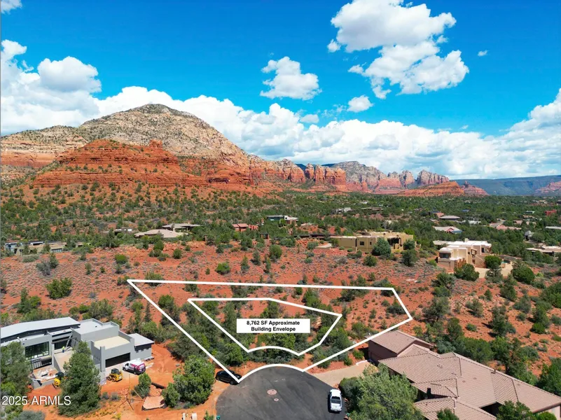 Large 0.74 acre Lot. The Lot has an extensive Building Envelope of 8,762 square feet as shown on the attached Boundary Survey (a larger 24 x 36 inch drawing is available). The total B/E may be disturbed when building a home. Minimum house size of 2,000 square feet.. All utilities are to the Lot, including Sewer which is owned & maintained by TMR, Unisource Natural Gas, Arizona Water and APS. A very important feature is that this Lot has ''Zero'' flood or drainage issues as documented in the City of Sedona's Public Works report and colored aerial (attached). Lot is close to hiking trails, and in the midst of panoramic views. Listing Agent has a contact list of Custom Home Builders who are familiar with TMR requirements