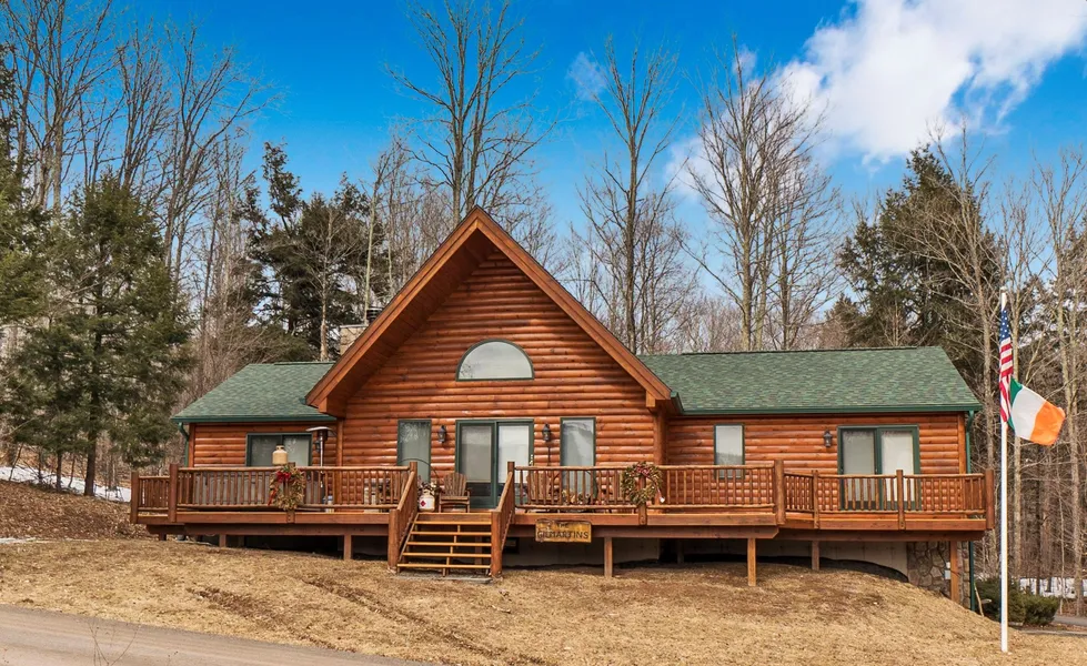 Views and location reigns supreme here! Enjoy unobstructed views of Windham Mt slopes from this beautiful well maintained 4 bedroom 4 bath log cabin chalet. Set off a private road in a a desirable development and just a mile from charming Main Street, offers rustic country charm with unbeatable convenience- the best of both worlds! Wake up to inspiring year round mountain views in the light filled open floorplan featuring vaulted knotty pine ceilings, gleaming hardwood floors, authentic blue stone wood burning fireplace, cooks kitchen with granite counters and large center island plus a dining area for sharing meals together. Main floor Master has access to large wrap around deck with personal hot tub, gas fireplace and a pair of Adirondack chairs calling your name. Finished basement equipped with bar, lounge area with pool table (stays) 4th bedroom, full bath and entrance hall with storage. This well appointed home comes fully furnished and sports a brand new 30k metal roof, Wow!