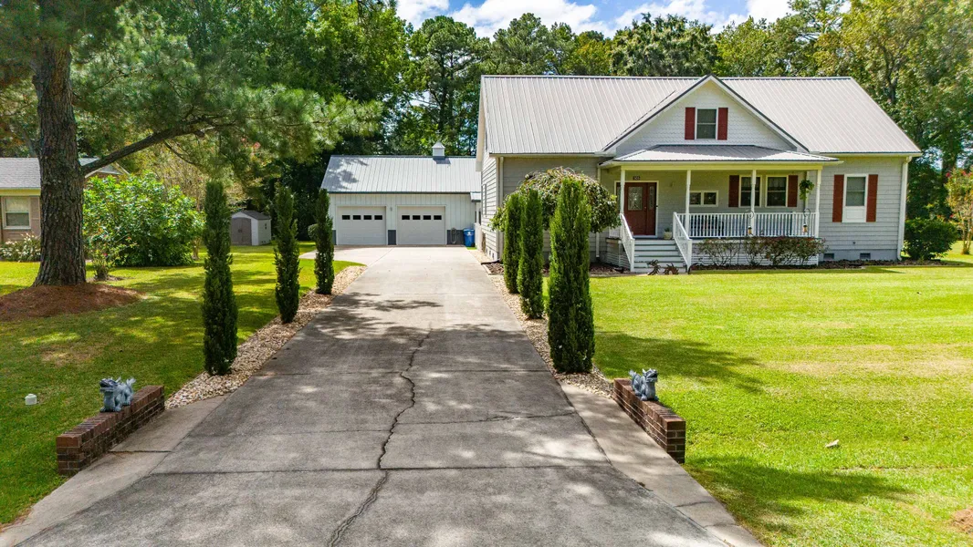 This beautifully maintained 4-bedroom, 3.5-bath home is ideally located in the village of Oriental, offering space, comfort, and flexibility—perfect as a weekend retreat, vacation getaway, or full-time residence. The home features two primary suites on the first floor, each with an ensuite bath, along with a spacious kitchen, gas fireplace, and a bright, open living area filled with natural light. Upstairs, you'll find two additional large bedrooms, a full bath, and an office, with a hallway that overlooks the open-concept living space below. Complementing the home is a 2-car garage with a workshop and an attached studio apartment, ideal for visiting guests, hobbies, or additional flexibility. Just behind the garage, a 24' x 30' shop provides generous space for storage, creative pursuits, or added workspace—an excellent bonus without detracting from the home's inviting character. All buildings on the property are located outside the flood zone, offering added peace of mind. The property is within walking distance of Oriental's downtown shops, dining, and waterfront charm. The home is being sold fully furnished, and the sellers are including a one-year home warranty covering major appliances and the HVAC system. Enjoy village living, coastal charm, and space to spread out—all in one inviting Oriental home.