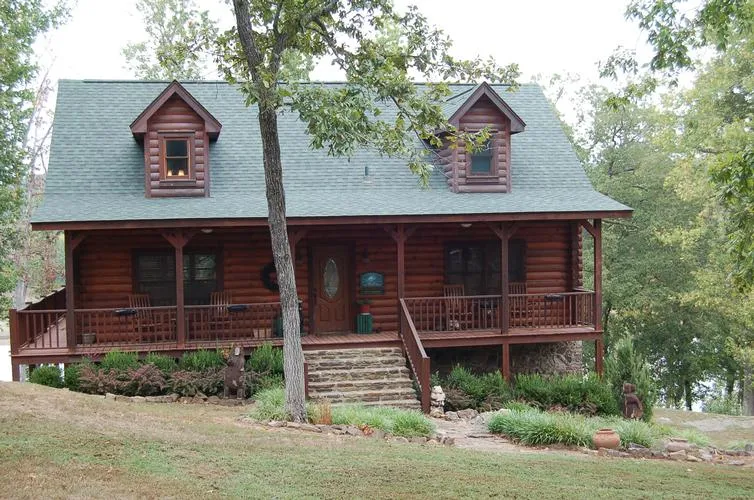 Picture perfect log cabin on the lake with an outstanding view. This dream home is so beautiful, it was featured in Country’s Best Log Homes. Native stone steps, country porch, exposed beams, granite tile counter tops, oak flooring, vaulted ceiling cedar staircase leading up to the loft bedroom, gravel path to the lake, gameroom (currently used as additional sleeping quarters,