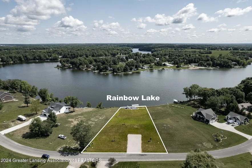 Fully Developed Custom Waterfront! 80 ft of Lakefront All-Sports Private Rainbow Lake Perrinton MI on .76 acres. New cobblestone see wall, lakeside Cabana (w/electric, California door), and charcoal stamped patio. Dock and Hydraulic Tri-toon lift included. Just park and go! Eight car driveway has 18 inches of gravel below crushed stone on top. Maple trees and one Cleaveland pear for shade and beauty. With one of the best views Rainbow Lake has to offer; this property is situated just 30 miles from Lansing, 1 hr 15 min from Grand Rapids and 2 hours from Detroit. Rainbow Lake community has a low HOA fee of $175 a year. RV or tent camping is not allowed on vacant land but there is a primitive camping area in the community available for owners. There is seasonal boat storage available, parks, beaches, pickleball courts, and community events. For your new lake house there is municipal sewer, natural gas and high-speed fiber optic internet. Start creating your lasting memories at the lake with all this property has to offer. *Pictured lot lines are estimated.