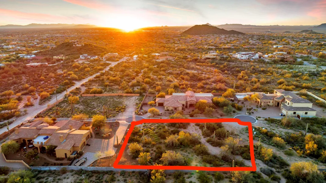 Mountain and city light views with breathtaking sunsets. This quiet luxury community of 6 lots is an excellent option for those in search of a no HOA lot within a stately community of gorgeous homes in the million dollar plus range. Mostly flat, easy to develop, 3/4 acre lot with exceptional natural vegetation. Easy access to the 202.