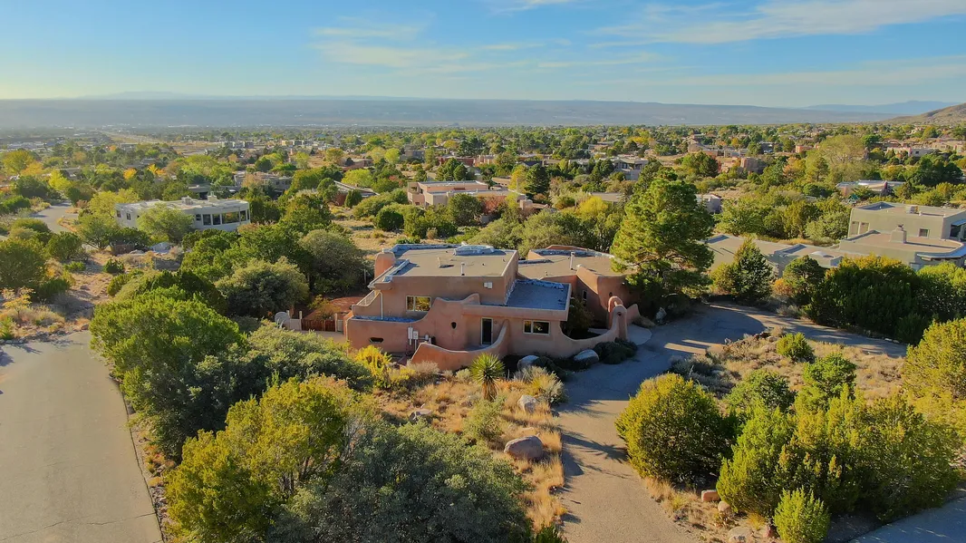 Unique Pueblo design and elevation- true Santa Fe appointments / accents throughout this inviting home with mammoth views! Custom construction by Canyon Concepts- well known builders in Sandia Heights. Proud owners made continual upgrades / updates throughout their ownership. Interior features raised T&G and plank beam ceilings, postas, one of a kind Kiva fireplace, two wood stoves and gorgeous exposed adobe walls. Incredible charm, natural light & huge views greet you in every room. Multiple large living & dining areas- all with awesome east / west orientation & mountains to city vistas. Relaxing outdoor living with inviting courtyard entry, view balcony, large patios plus Judith Phillips southwest landscape design all will captivate you. You don't want to miss this- call to see it today!