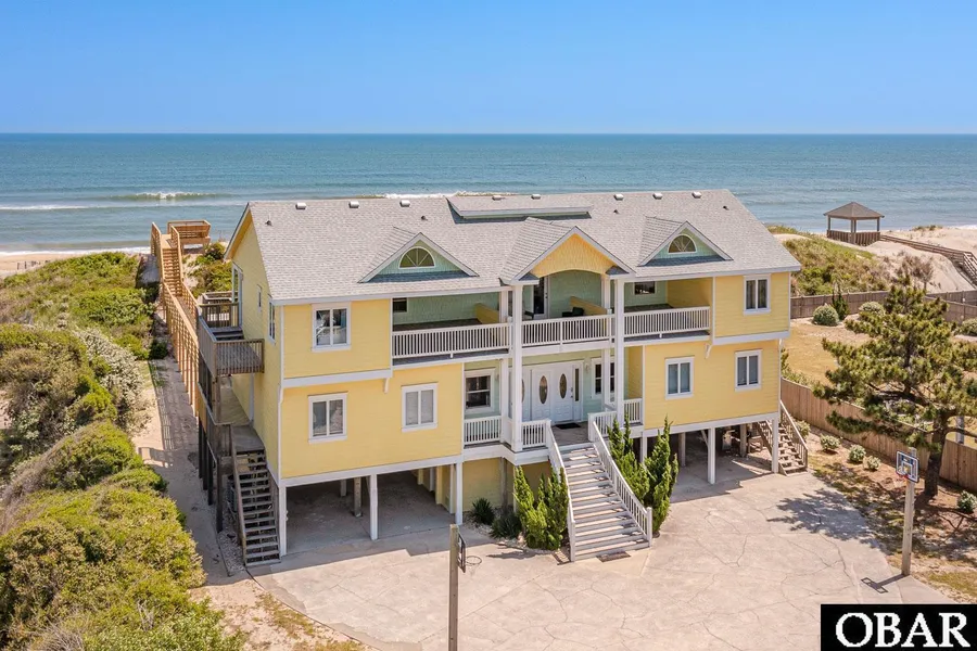 Perched on a rare and expansive 35,000 sq. ft. oceanfront lot with an impressive 100 feet of shoreline, this beautifully remodeled home offers 5,432 sq. ft. of elevated coastal living. Designed to capture sweeping ocean views from every floor, the residence features eight bedroomsincluding six generous en-suite primaries, two bunk roomsand eight full bathrooms, blending comfort, space, and style in a truly one-of-a-kind setting. Lovingly maintained and turnkey, the home shows exceptionally well. Designed with coastal resilience in mind, the structure is fully elevated with no ground-level living space, minimizing the risk of moisture retention and water intrusion often associated with slab foundations. Built with true beach-home integrity, it reflects smart planning for long-term durability, comfort, and peace of mind in an oceanfront environment. The ground level features a spacious dry entry with ample storage and elevator access to the top floor. The mid-level offers two mirrored wings, each with two primary suites and a bunk room, plus access to oceanfront decks and stairways leading to the pool and parking areas. A large game room with pool table and TV, a laundry room with deck access, and a covered porch facing the ocean complete this level. The top floor showcases a dramatic living room framed by floor-to-ceiling windows, double sliders, and a 78-foot oceanfront deck that spans the entire length of the homeperfect for entertaining and soaking in panoramic views. Adjacent to the living room is a granite bar area, multiple sitting spaces, and a spacious primary suite featuring a newly updated tile shower in 2025 (not reflected in pictures). Both top-floor bathrooms have been remodeled with stylish tile finishes, and all carpeting throughout the home was replaced in 2025. The expansive kitchen and dining area is a true showpiece, designed to accommodate large gatherings. It features stunning white italian marbled granite countertops, double ranges/ovens, a prep sink, stainless steel appliances, and generous counter space for effortless entertaining. The space is wrapped in wall-to-wall windows and finished in soft seaside coastal tones that reflect the beauty of its oceanfront setting. Another primary suite is located just off the kitchen, and stairs at the end of the hall lead directly to the oceanfront pool and the front of the home. Exterior features include a fiberglass in-ground pool, hot tub, volleyball area, fish cleaning station, outdoor shower and commode, and a newly built dune deck and walkway to the beach (2024). There is covered parking for four vehicles and additional space in front of the home. The property has smart siding on three sides, a new roof installed in 2018. Recent upgrades include new stainless steel kitchen appliances, interior paint, new furniture throughout, new mattresses (May 2025), remodeled bathrooms (two mid-level in 2024 and two top-level in 2025), new carpet (May 2025). 4 HVAC units at the property: 1 was