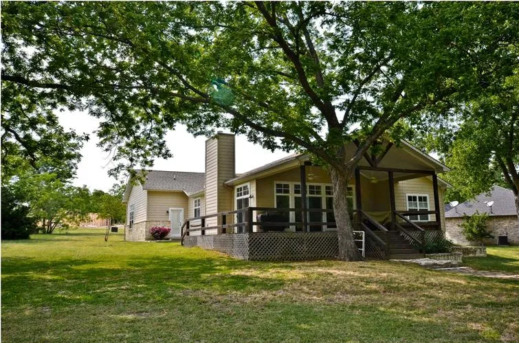 Custom lake home with open kitchen living area, large walk-in pantry, utility room with sink, huge gameroom with built-ins & beautiful stained concrete floors throughout home. Large windows in all rooms with Bali blinds & awesome views. Covered deck wired for sound system & perfect for entertaining! Winding flagstone path down to boat house with electric boatlift, storage, sink & party deack. Large pecan trees tower over backyard!