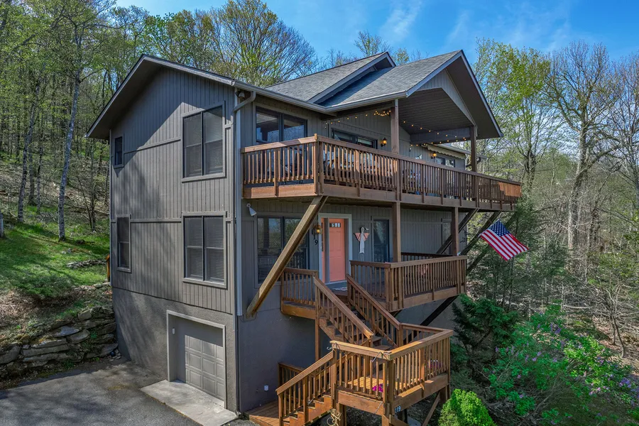 Beautifully maintained four-bedroom, 2.5-bath home with stunning long-range mountain and sunset views! All sitting atop a .82-acre double lot. The main level and top floor have an open concept kitchen and den, and dining room with beautiful, vaulted tongue and groove ceilings and stone gas fireplace. Windows offer natural light and the opportunity to take in the mountain ranges. Nestle by the gas fireplace or step outside to the lovely covered porch to enjoy the views and wildlife. The primary bedroom is located off the den with sliders to access the deck. On the second level you will find three guest bedrooms, full bath and laundry room. Your guests will even have their own family room with a covered porch. The lower level has a spotless one-car garage and a convenient mud room with plenty of storage. Central air conditioning and heat. This home is not in the rental program but would do...
