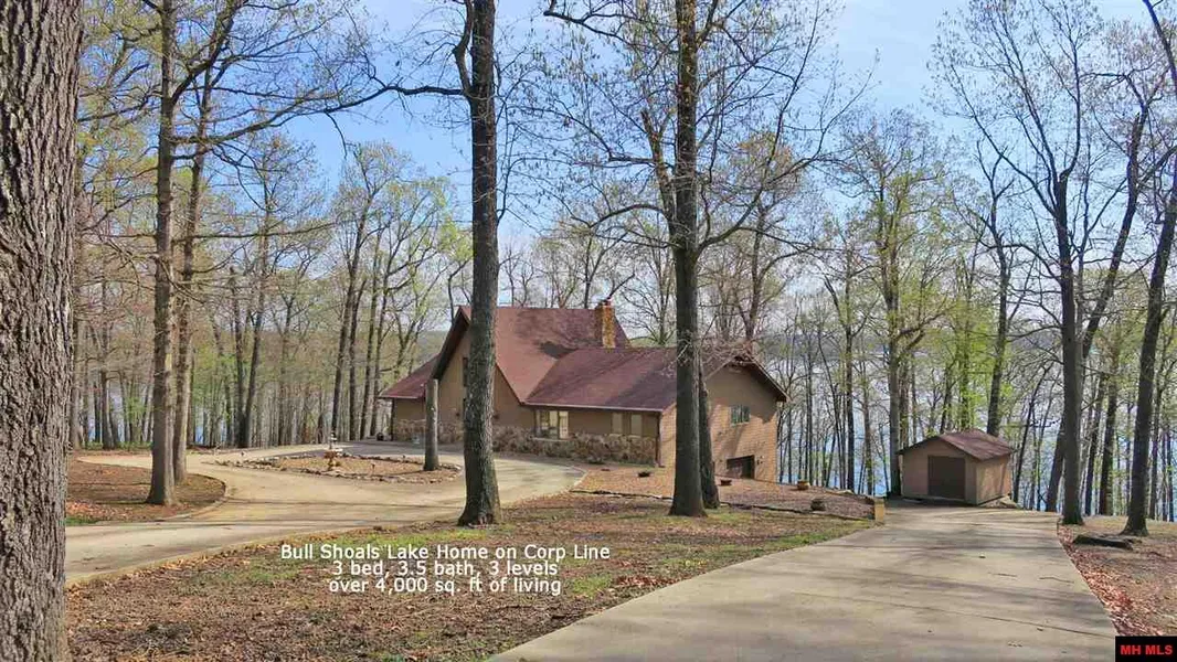 Bull Shoals Lake home in Woodstone Subdivision on Army Corp line w/view of Lake. 3 levels of living, +4400SF, 3 bedrooms, 3.5 baths. Main level 2 story vaulted foyer, living room, natural stone wood burning fireplace. Oak floors, 2 sets glass patio doors to 24 x 12 elevated deck. Cooks kitchen w/stone counters, custom wood cab's, stainless appliances, electric cooktop on island, bow window for lake views. Formal dining room, Master bedroom & bedroom #3 have big windows w/ lake views. Bath has 2 sinks, shower & private soaker clawfoot tub. Utility room on main. 2nd floor bedroom #2 Jr. as a suite w/private bath and Juliette balcony. Poured concrete, walk out LL has family room, office space, full wet bar, wood burning fireplace, safe room, gun room, attached screened patio, 2 car garage, w/storage and workshop area. Hardiboard siding, new roof 2017, Garden shed, concrete circular drive and seller says "we can get to the water's edge!" Near to Browns Beach & Bulls Shoals Marina.