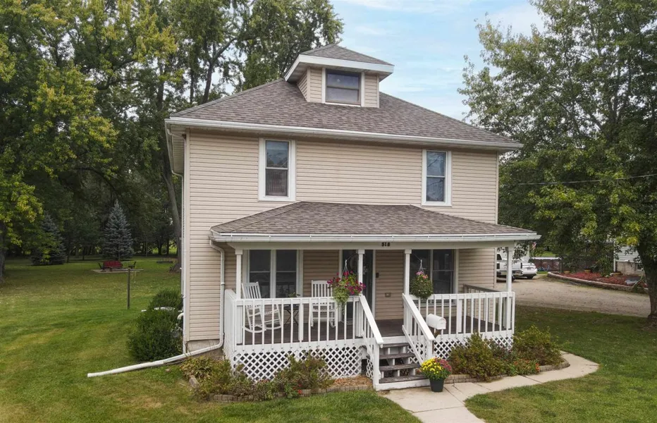 Nestled on .83 +/- acre lot with 71 ft +/- of Rock River frontage this mature tree lot is an incredible city find! The large country inspired front covered porch is a great spot to relax and opens to the bright and light main floor. Step inside to be greeted by hardwood floors and sizable GR. French doors from the GR lead to main floor primary bdrm w/walk-in closet. Tucked behind the living space the fully appliaced eat-in kitchen w/ss appliances, and white painted cabinetry. Back mudroom includes FF laundry and wash sink area. Large full bath completes the main floor living space. The upper level consists of 2 HUGE bedrooms, loft area, and 2nd full bath. Additional features include; full basement, 24x32 garage, backyard patio, easy HWY access and much more!
