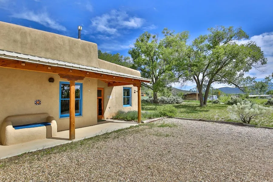 This immaculate master piece 2 bath, 1 bed, 1537 Sqft home sits on lush acreage in a peaceful setting. The setting invites a feel of country living yet is only a few minutes away from all the amenities Taos has to offer. Conveniently located off a paved road, access throughout the year is an ease. Upon entering the home you'll feel at ease with the temperate ambiance, well thought out floor plan, and high ceilings. Three sides of windows in the open living room afford stunning views of the Picuris mountain range and the Weimer foothills. Entertaining guests in the full sized dining room is a breeze and beautiful accents throughout the room create a comfortable space, not to mention the enamel natural gas stove. Natural light filters into the cozy kitchen with solid wood cabinets and a wood burning Kiva fireplace in the corner. A small nook next to the Kiva is a great place to put a writing desk, sewing machine, or use as a reading nook and just above it is a sleeping loft. Large vigas and split cedar ceilings adorn the large master bedroom with a en suite full sized bathroom. In the master bath sits a cast iron clawfoot tub, pine tongue and groove ceiling, and a window with a private view. A full sized washer and dryer is located in a dedicated closet in the master bathroom. The home boasts many high end finishes, such as, diamond and adobe plastered walls, etched stained concrete and flagstone floors, wood encasement windows, hand peeled vigas, and split cedar wood ceilings. The North facing portal is a great place to enjoy the outdoors with a grand view of Taos Mountain. Fully mature trees surround this home, providing privacy and shade; enjoying the outdoors has never been easier! The home has it's own water well, septic system, and natural gas hookup. Come see this gem, you'll truly feel welcomed as you enter the front door.