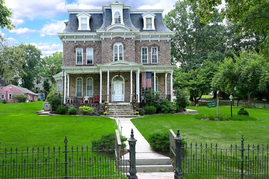 Tucked on a quiet street on Cottage Hill where antique houses live side-by-side, this stone grand dame has an impressive presence. Built by a railroad executive in the 1860's, it has architectural details such as eleven foot ceilings, large windows with arched transoms, a mansard roof and a grand front porch. There are eleven bedrooms and five and a half baths. The almost one acre property has parking for six cars in addition to a guest cottage.