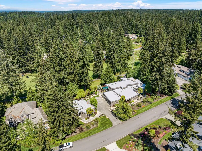 If you are looking for that special one of a kind Canterwood Fairway home, look no further! This contemporary Hoppet designed one level home sits above the 2nd frwy. A dbl lot that consists of a 4387 sqft main home with a 988 sqft gst home. The open concept layout has a chef's kitchen that flows into the dining rm and gorgeous grt rm. Slide back the doors for more entertaining space and you have a large patio and your own infinity edge pool, spa and wood burning fireplace. The primary has 8' tall wndws and french drs that also open to the patio. A cool Jack and Jill area with 2 bdrms, bath, laundry along with separate guest quarters round out the main home. The ADU consists of everything you would need for your gsts to never want to leave!