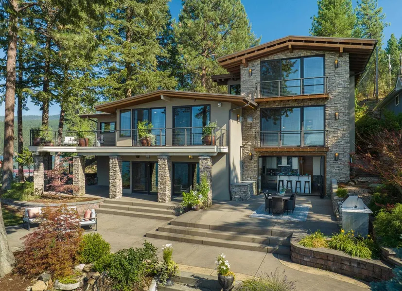 "Pines on the Point". This Luxury waterfront home and guest house situated at the South end of Liberty Lake boasts 4 Bedroom, 6 baths, plus a stunning gym|office|sauna|steam shower will not disappoint. 350 feet of waterfront with expansive windows showcasing exceptional lake views from almost every viewpoint. The chefs kitchen, wine room and lower level walkout indoor|outdoor kitchen provides awe inspiring outdoor entertaining in the park like back yard. Just steps to the waters edge or a short walk to the beach; all situated on your own property. On a secondary parcel, sits a one bed, 1 bath guest house|private office above a 2 car garage, plus an upper level parking area to accommodate RV, Boat or guest parking. The main home has an additional 2 car garage. Too many details to list. Please come explore all the luxuries this home has to offer.