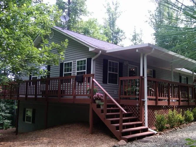 3/3 home with vaulted ceilings, hardwood floors, and approx 2200 sq ft htd. Beautifully built with nature in mind. Master suite has a tray ceiling, and tile walk in shower. Generous closets throughout. Den/gameroom in lower level is tiled and has built in cabinets and large tv. Very private wrap deck opens to a large covered porch and BBQ bumpout. Drive under 1 car garage, poured concrete patio, circular drive and area for an additional garage. Lovely home.