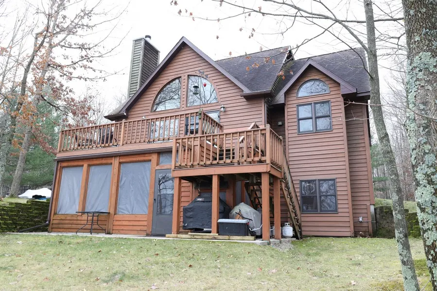 Uplifting 4 bedroom, 3 bath lake home is a fun place for gathering with family and friends! Greatroom is light and bright with brick wood burning fireplace, vaulted wood ceiling, double patio doors to the deck and huge arched window offering beautiful lake views to both the main floor and loft. Open kitchen with granite counters, graphic tile backsplash and breakfast bar was remodeled in 2022 and is open to the dining area. Main floor master has vaulted ceiling, arched window and a desk area with a lake view. Open staircase leads to loft with sitting area, 2 bedrooms and a bath. Lower level has large guest room with bistro table nook, bathroom, large family room and laundry. Great design choices include bathrooms on every level, screened entry porch and screened patio area under the main deck. Property has .85 acres and 150 feet of frontage on this clear water lake, just 10 minutes from ...