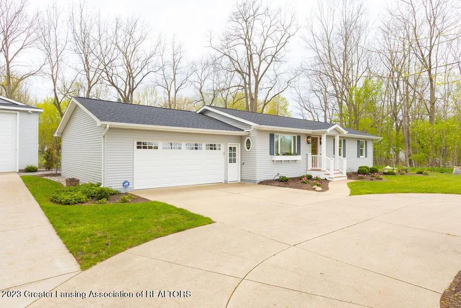 Laingsburg - fabulous new offering with this stunning and updated 2300+ square foot ranch home nestled on .86 acre parcel around the corner from downtown Laingsburg - the circle driveway sets the tone with a maintenance-free front porch and charming window boxes! The open floor plan allows for a beautiful living and dining area complete with luxury vinyl plank flooring. A stunning kitchen including a center island, cherry-stained cabinets, solid surface countertops, stainless steel appliances, reverse osmosis water supply, and pantry space. Access to the charming 3 season panoramic sunroom with seasonal windows and screens, plus access to the patio and 1320 square foot detached garage/pole barn (with reinforced concrete floor) perfect for RV, boat, car, trailer storage, or pickle ball and other hobbies! Enjoy the 16 ft door plus service door! Beautiful newer landscaping and park like set...