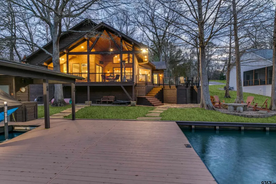 Wake up to breathtaking lake views and unmatched serenity on Lake Cypress Springs! This stunning waterfront property in the coveted Pine Valley Subdivision is not just a house—it's a lifestyle waiting to be embraced. Featuring a fully furnished 5-bedroom, 5-bath home with all bedrooms conveniently located on the ground floor, this beautifully designed lakehouse has been recently updated with no expense spared. It boasts a chef's kitchen that is open to the dining area and is elegantly appointed with a center island, and breakfast bar, custom cabinetry, stainless-steel appliances, and a wine fridge—perfect for entertaining. A versatile loft-flex space offers extra sleeping, a game room, or an office. All around the home, custom windows are designed perfectly to take in the scenery. The spacious primary offers the most stunning water views! You will wake up refreshed and ready to LIVE the lake life and all it has to offer. The additional bedrooms promote restful nights and peaceful mornings, while the sunroom offers a serene retreat, blending indoor comfort with outdoor beauty. Step outside onto the expansive decks to take in breathtaking water views, ideal for quiet contemplation or lively gatherings. Walk the gentle slope down to the private boathouse that is a true waterfront escape, complete with outdoor seating for relaxing lakeside moments. Located in a secured, gated community with friendly neighbors, you'll enjoy amenities, including a sparkling pool, tennis courts, and scenic roads perfect for biking and hiking through the peaceful Piney Woods. A detached garage provides ample parking and extra storage for all your lake essentials. A security gate ensures safety, allowing for carefree exploration of your surroundings, whether on land or water. In addition to the waterfront lot, an inner lot across the road is included. Whether you're seeking a peaceful retreat or a place to create lasting memories, this is it. Don't let this chance sail away!