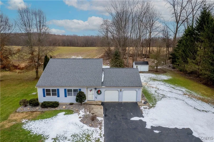 Beautifully maintained home on nearly an acre near the popular Village of Elbridge—famous for its rolling drumlins and stunning vistas. Enjoy a scenic 15-minute commute to Syracuse or Auburn and quick access to Skaneateles Village/Lake – one of Central New York's most popular destinations. Located on a quiet road minutes from major highways, this home features vaulted ceilings, a first-floor primary bedroom, a luxurious bath (new shower, sink, flooring, fixtures, and fresh paint), a second full bath upstairs, freshly painted family room with new carpet, gleaming ¾" hardwood floors, and a modern kitchen with new backsplash, fixtures, and upgraded lighting. Enjoy a paved driveway with a turnaround, a spacious deck, a 10x16 electrified shed, professional landscaping, and low utilities (natural gas!) averaging only $200 per month. Award-winning Jordan-Elbridge School District offers free meals, accelerated courses, arts, athletics, the 2025 NYSFBC championship marching band, and U. S. News & World Report recognition—plus a full-day Pre-K program for 3 and 4-year-olds that includes transportation. Don't miss this perfect blend of country charm, community spirit, and a short urban commute - schedule your private showing today!