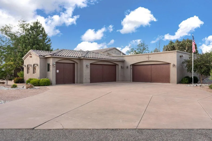 Stunning estate in North Albuquerque Acres, this masterpiece home is set against the backdrop of the Sandia Mountains, featuring meticulously designed interiors and an entertainer's paradise outdoors with park like backyard with lush greenery and vibrant flowers, outdoor kitchen, sparkling pool and spa, and separate guest house. The grand living room boasts soaring wood cathedral ceilings to create a warm, inviting atmosphere. The chef's kitchen is a culinary masterpiece, featuring top-of-the-line Wolf and Sub-Zero appliances, a full wine refrigerator, and custom cabinetry, offering both functionality and beauty. The home's thoughtful design includes custom closets in every room and an abundance of storage throughout. City utilites make this a hidden gem and is furnished with exceptions.