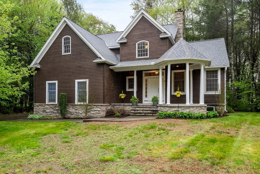 Nestled on a wooded lot just shy of an acre, this beautiful home offers a peaceful retreat surrounded by nature.The covered front porch sets the tone inviting you to relax & take in the tranquil views just beyond your doorstep. Come inside to discover an expansive layout ideal for both everyday comfort & effortless entertaining.The heart of the home is the generous kitchen filled with cherry cabinetry & a spacious eat-in area perfect for morning coffee. The formal dining room offers an elegant space for gatherings while the spacious living room features direct access to the back deck through sliding glass doors.Upstairs you'll find four bedrooms including a lovely primary suite with its own private bath & walk in closet. A second full bathroom serves the additional bedrooms while a breathtaking home office with cherry and birds eye maple cabinetry provides a quiet and inspiring workspace.Roof 2023 AC 2022 HW tank 2023 (APO). Freshly painted and ready for it's new home owner