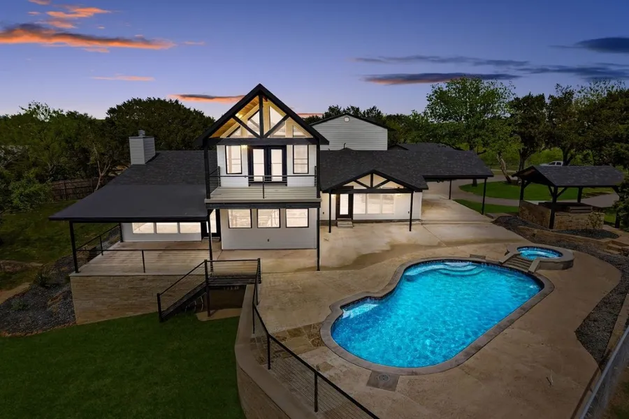 Exquisite design with Family gatherings in mind! Gated entry to This Modern, completely remodeled Lakefront estate offering clean crisp finishes with Walls of Windows, handsome stone fireplace, modern railings, marble countertops and many designer touches. With ample space for 2 families, this home boasts Main level open concept kitchen dining and 2 living areas. The left wing offers 2 guest rooms, an upper primary suite with lakeside balcony. The right wing provides a lower level primary suite with access to cozy and private lakeview patio, 2 upper guest areas and 3rd living or den with gaming area and balcony. You will enjoy the many outdoor spaces surrounded by lush landscape including a beautiful swimming pool with hot tub, and covered, well equipped kitchen. Two level deep water boat dock for your lake toys. Circle drive, detached 2 car garage. Perfectly situated on the Gaines Bend Cliff Line offering unparalleled views of Hells Gate and Possum Kingdoms crystal blue waters.