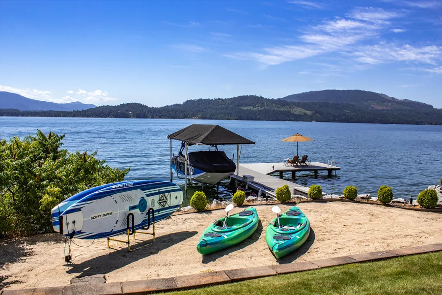 Rarely offered lake home in Sandpoint city limits on almost an acre with level lawn to the edge of your private beach, 140 feet of frontage, private dock with boat lift and stunning views. Arrive and unwind, prepare meals in the central kitchen with granite counters, large island and pantry. Fireplaces in both the living and family room and spaces that flow to patios and porches allow for intimate gatherings or larger-scale entertainment. Main floor efficiency has separate entry at the covered porch overlooking the water. Spacious second-floor master suite is designed for complete privacy and boasts commanding vistas. Four-car garage provides ample storage. The home was updated and remodeled by expert local builder, still in keeping with its original clean lines and honest design. No HOA or CC&Rs, vacation rentals are allowed. Furnishings may be negotiated. So convenient to restaurants, shops and Schweitzer Mountain for the full resort-town experience.